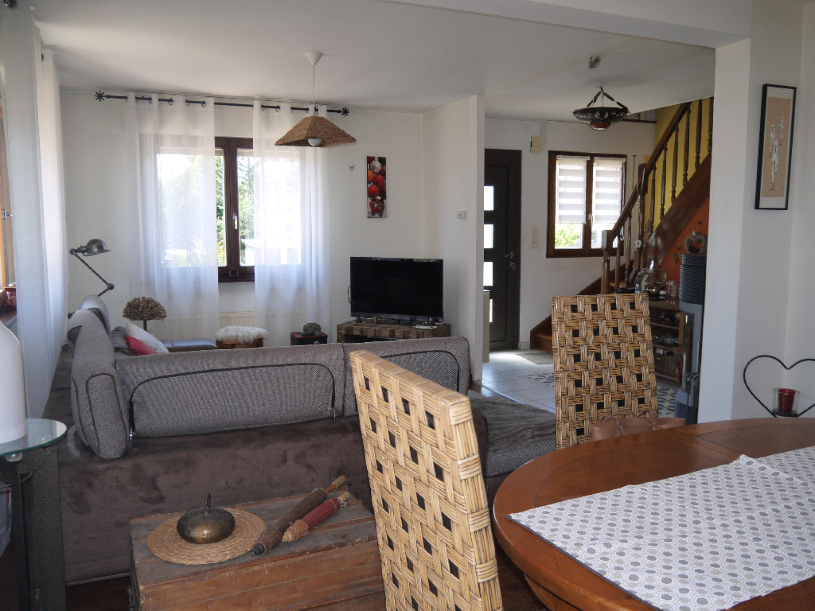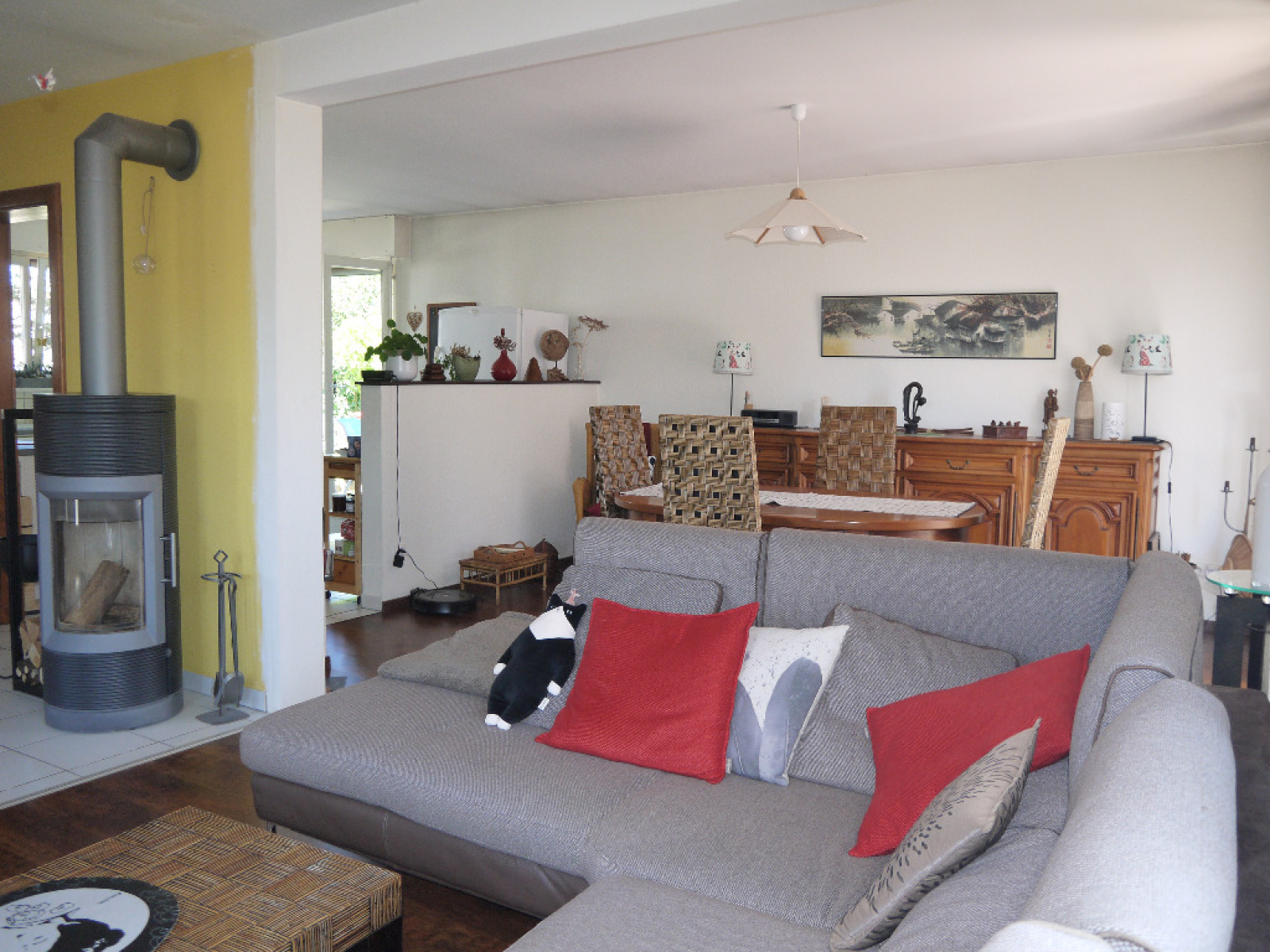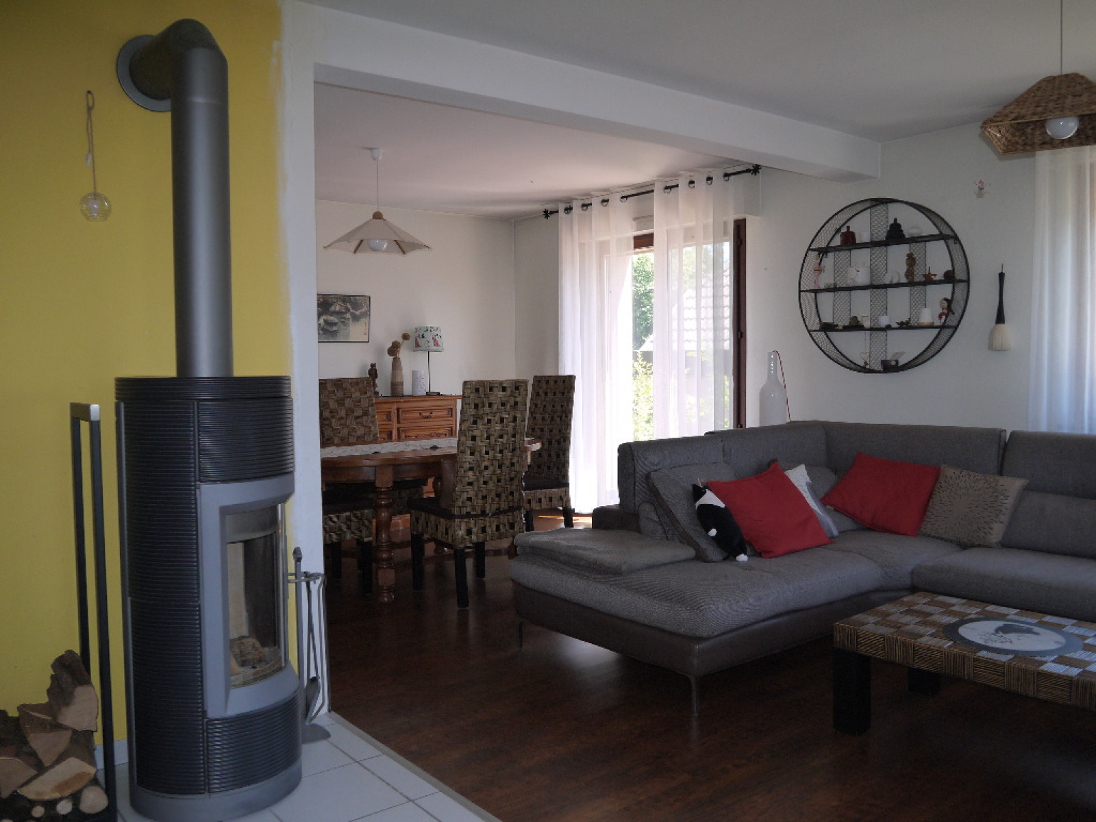 rdc: bel espace de vie traversant et lumineux de 42m², cuisine équipée ouverte, 2 terrasses, poele contemporain, salle d'eau éq, wc,