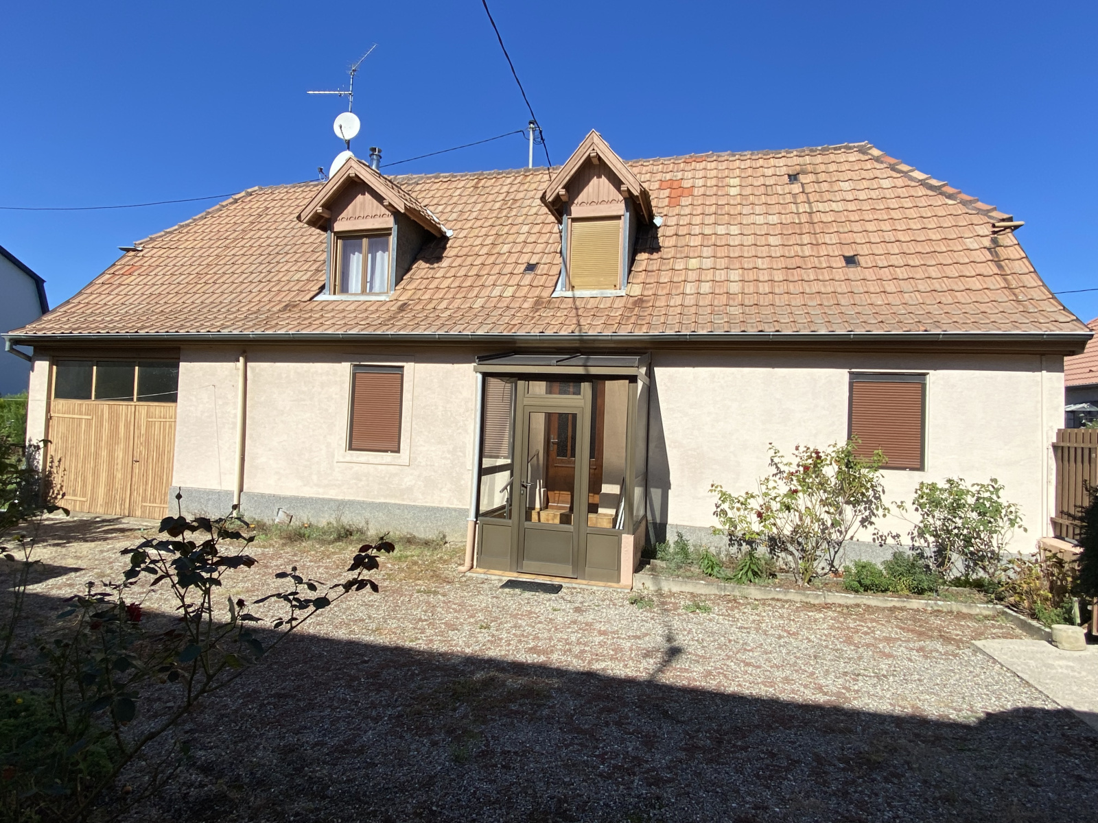 Charmante maison de village individuelle de 5 pièces, d'environ 90 m² sur 5,20 ares, située au centre de RIXHEIM dans une rue peu passante, proche écoles et commerces. Elle se compose comme suit :