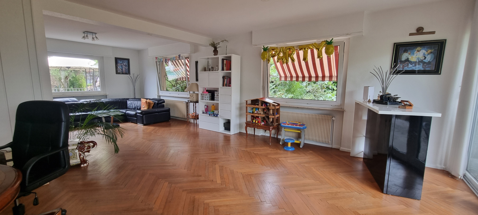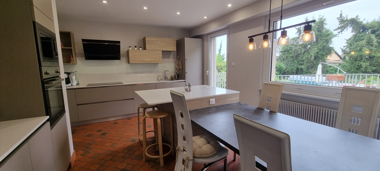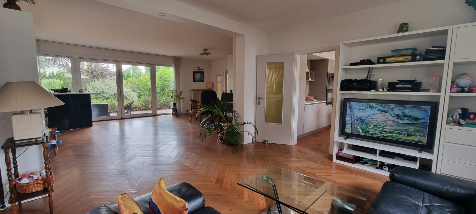 Belle pièce de vie traversante de 50m², avec cheminée, parquet chevron, accès terrasse; cuisine équipée récente haut de gamme de 19m², accès terrasse intime et vue sur jardin.