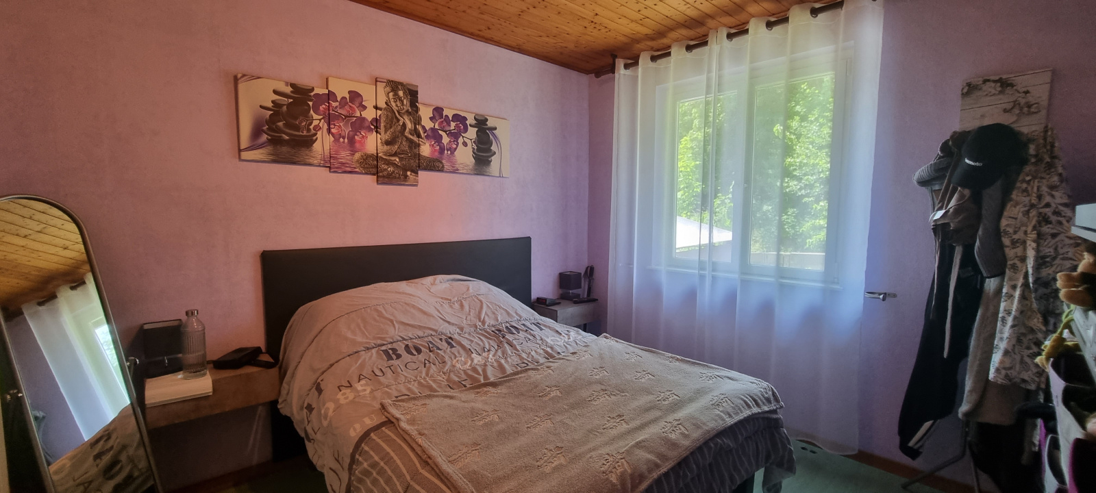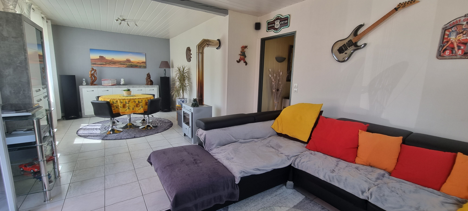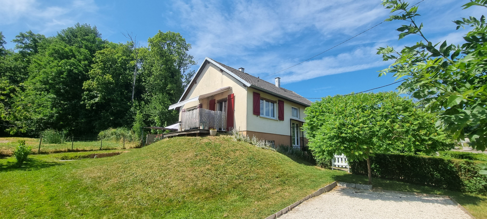 jolie maison plain pied 4/5 pièces, séjour clair avec poele et accès direct sur terrasse, bénéficiant d'une vue sur nature, cuisine et salle d'eau équipées, 2 chambres+1 en entre sol, cave, garage double+1 garage extérieur.