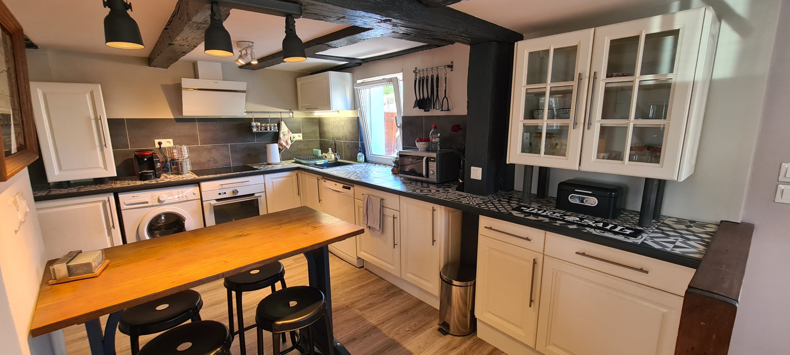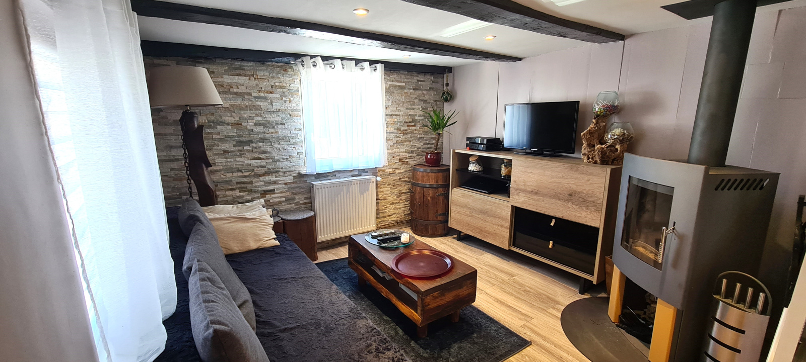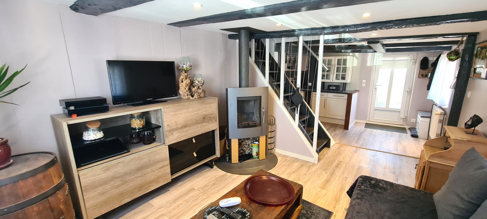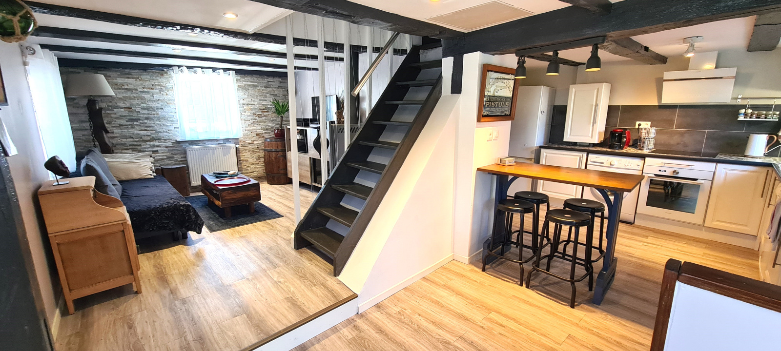 Charmante maison alsacienne 3p de 57m² au sol comprenant au rez-de-chaussée, une entrée, une cuisine équipée ouverte sur le séjour agrémenté d'un pôele à bois et une chambre.