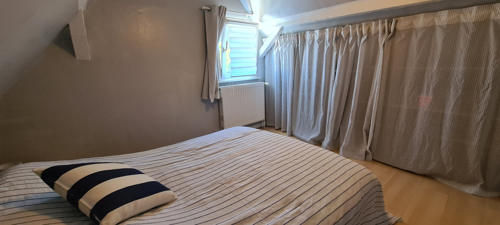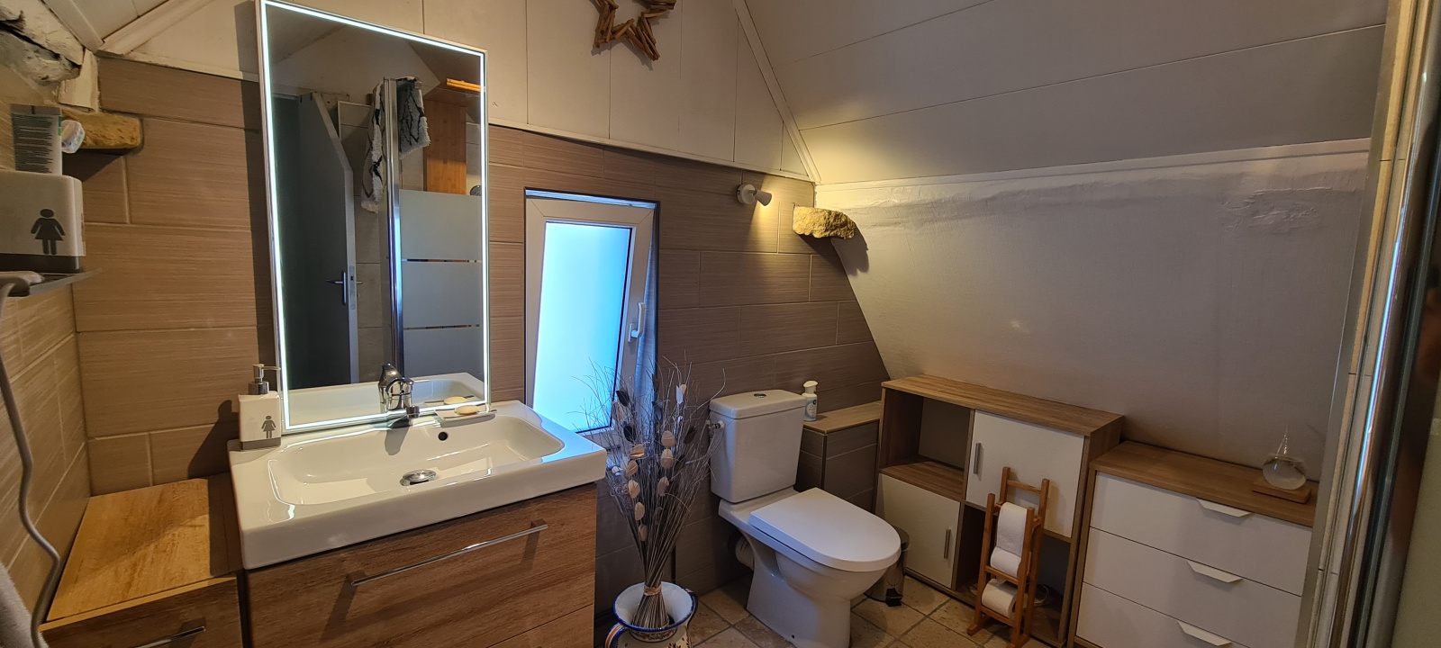 A l'étage une chambre avec étagère sous-pente, une salle d'eau avec douche et toilette.