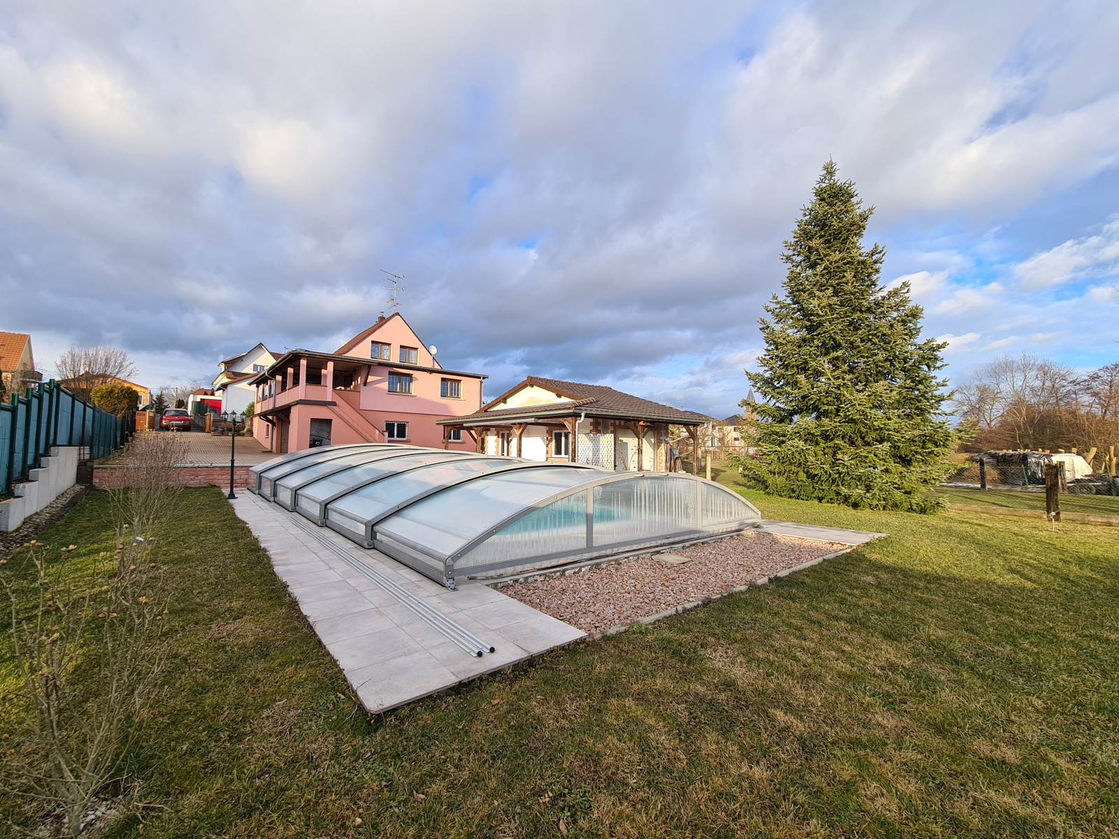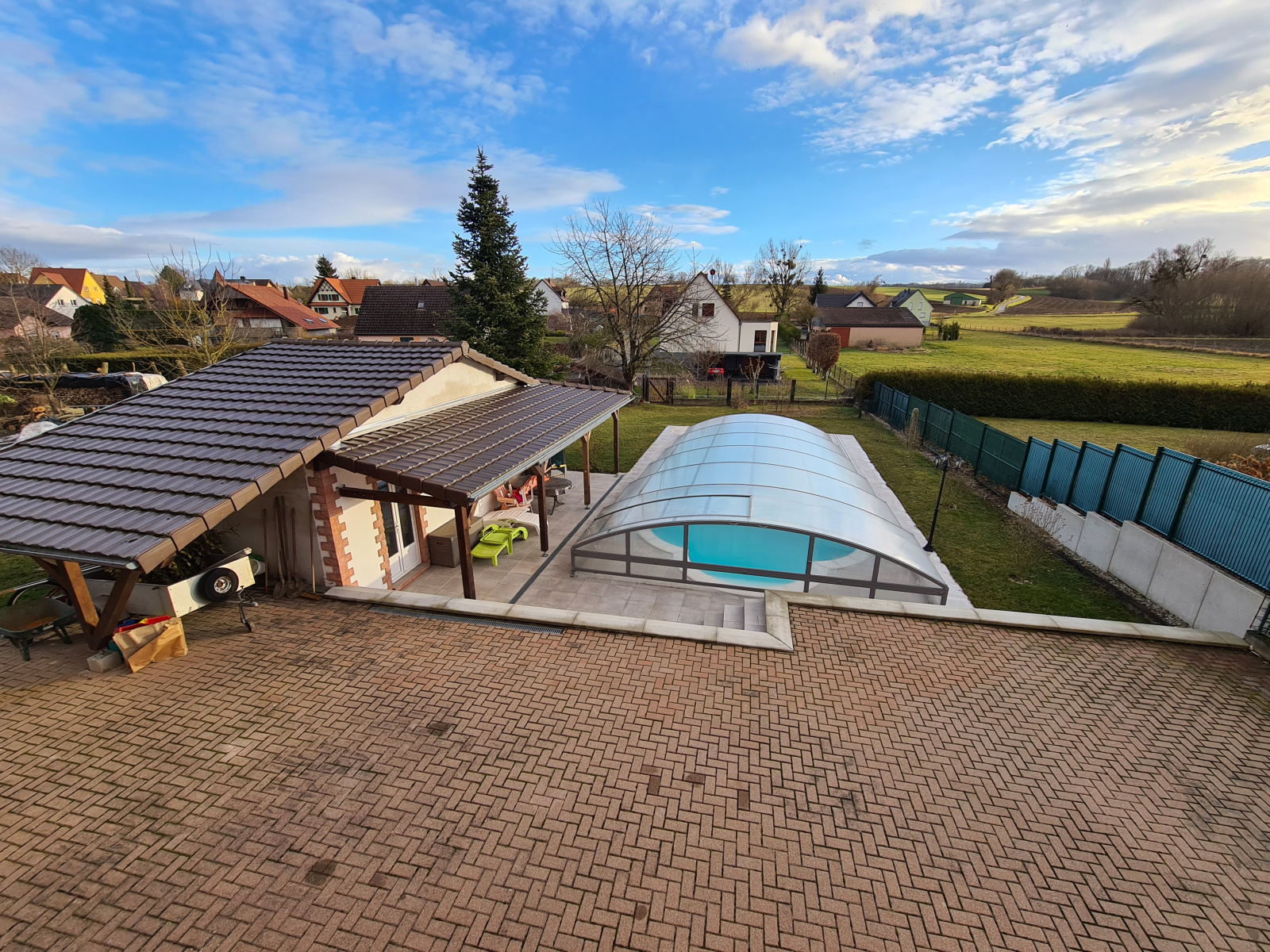 A l'extérieur, une grande cour pavée, un espace vert avec piscine 9x4,5m, un pool house.