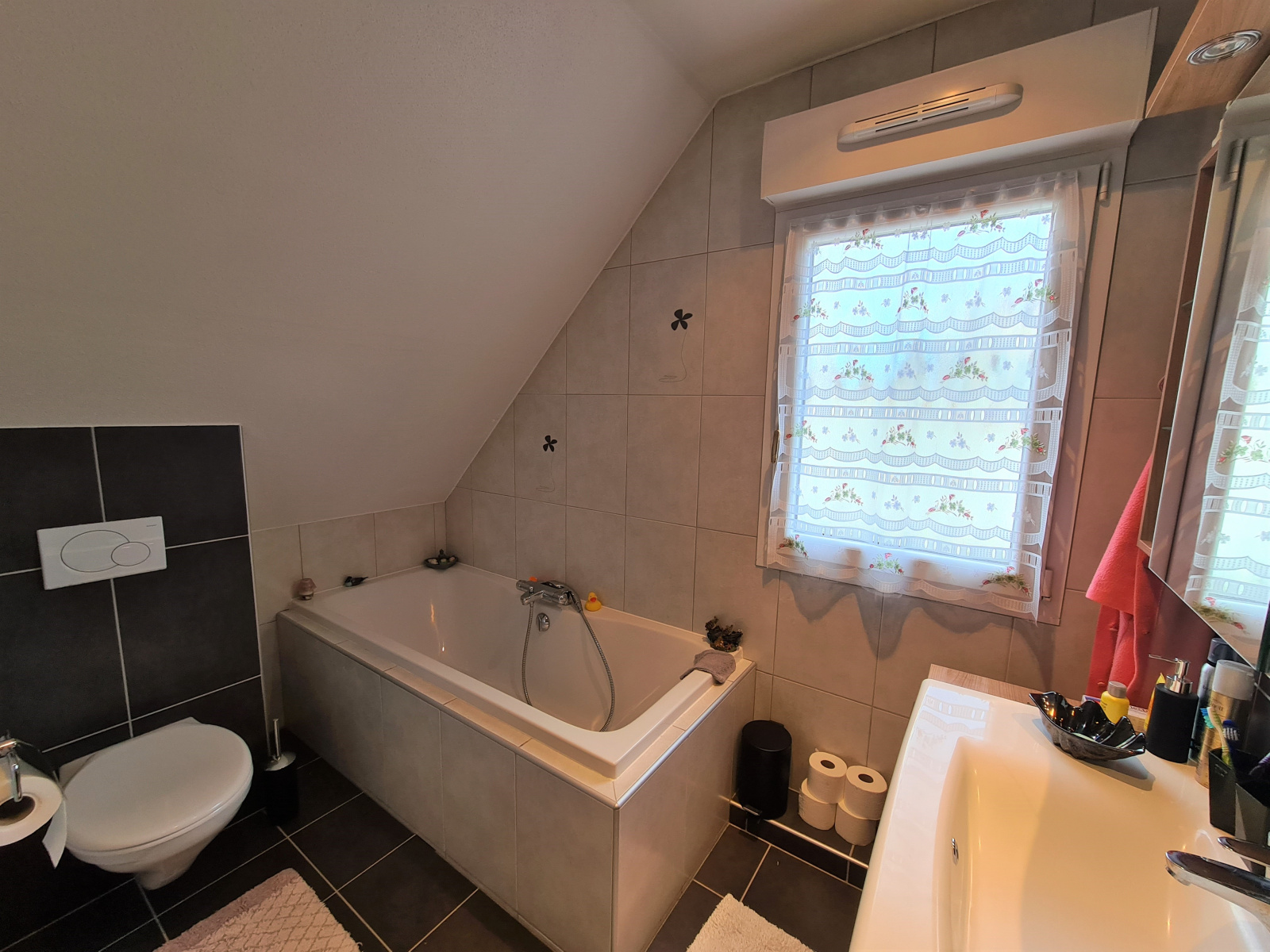 On trouve également un bureau, un espace détente et un WC séparé. A l'étage, une salle de bain équipée avec une baignoire, une douche et un toilette, 3 chambres dont une avec un balcon.