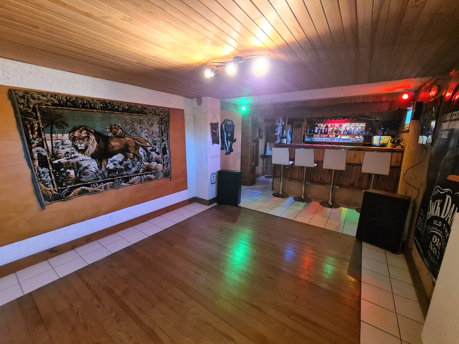 Sous-sol complet de 117m² avec bar et piste de danse, une buanderie, une pièce de stockage, un grand garage de 48 m².