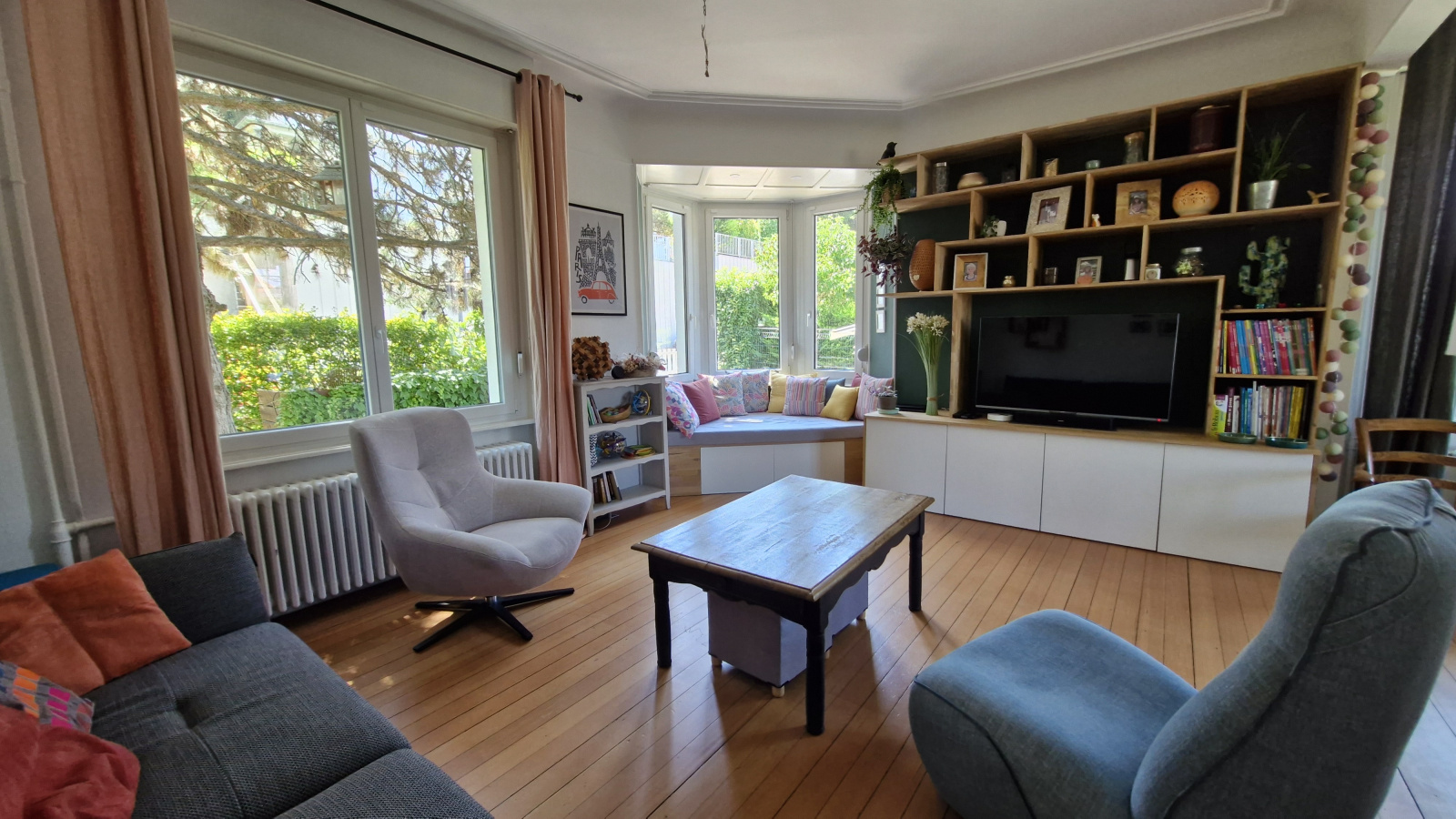 Au rez de chaussée: belle pièces de vie de 38m² avec bow window et parquet, cuisine équipée indépendante et cellier, wc, accès terrasse.