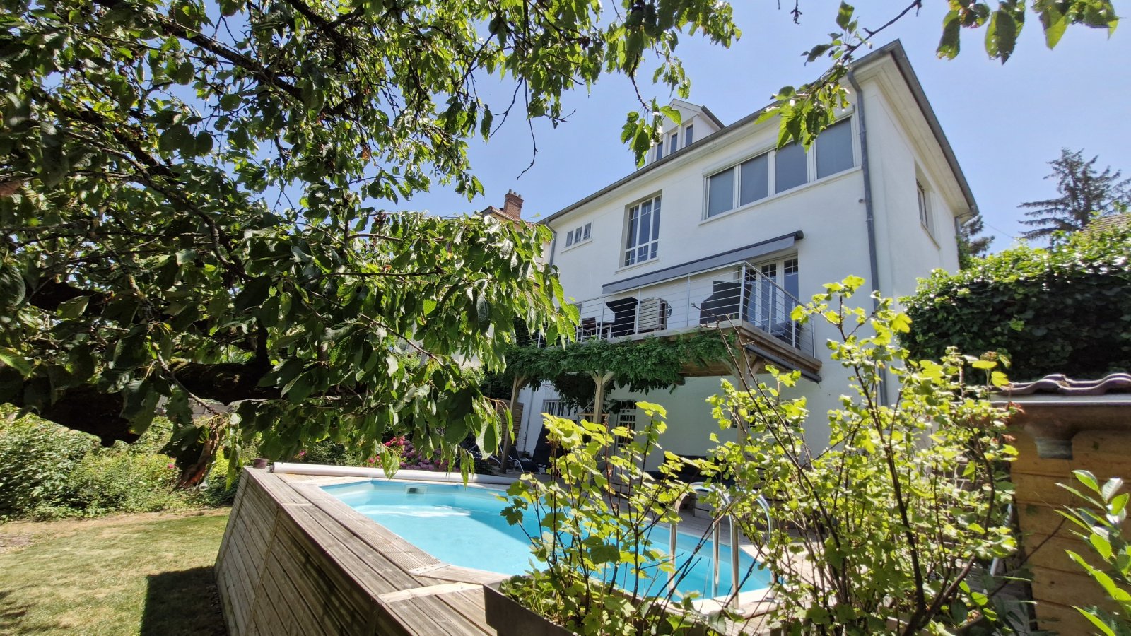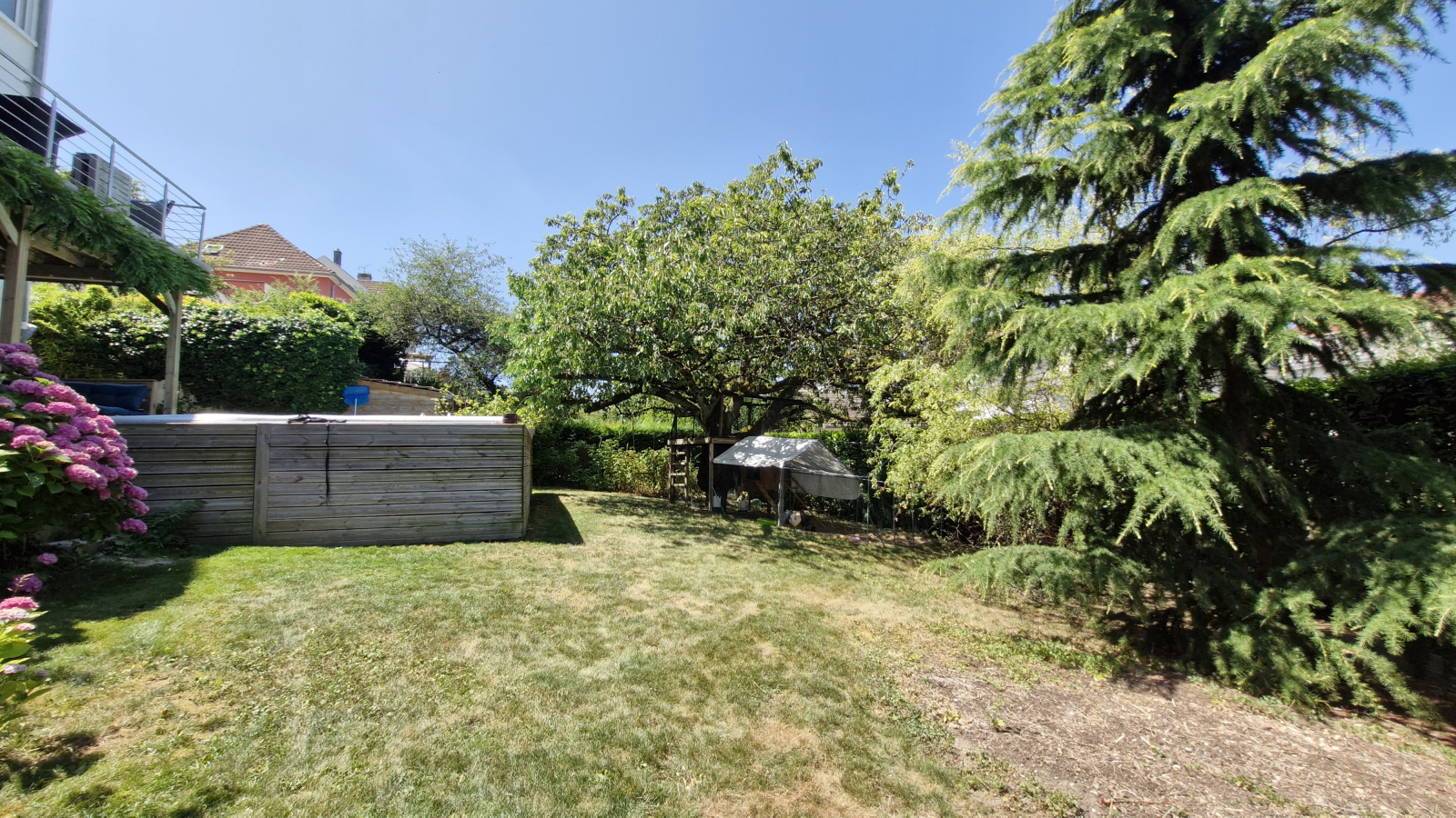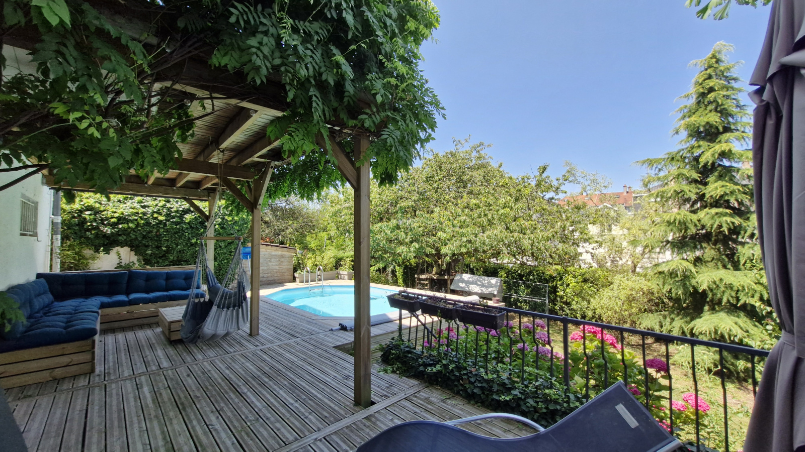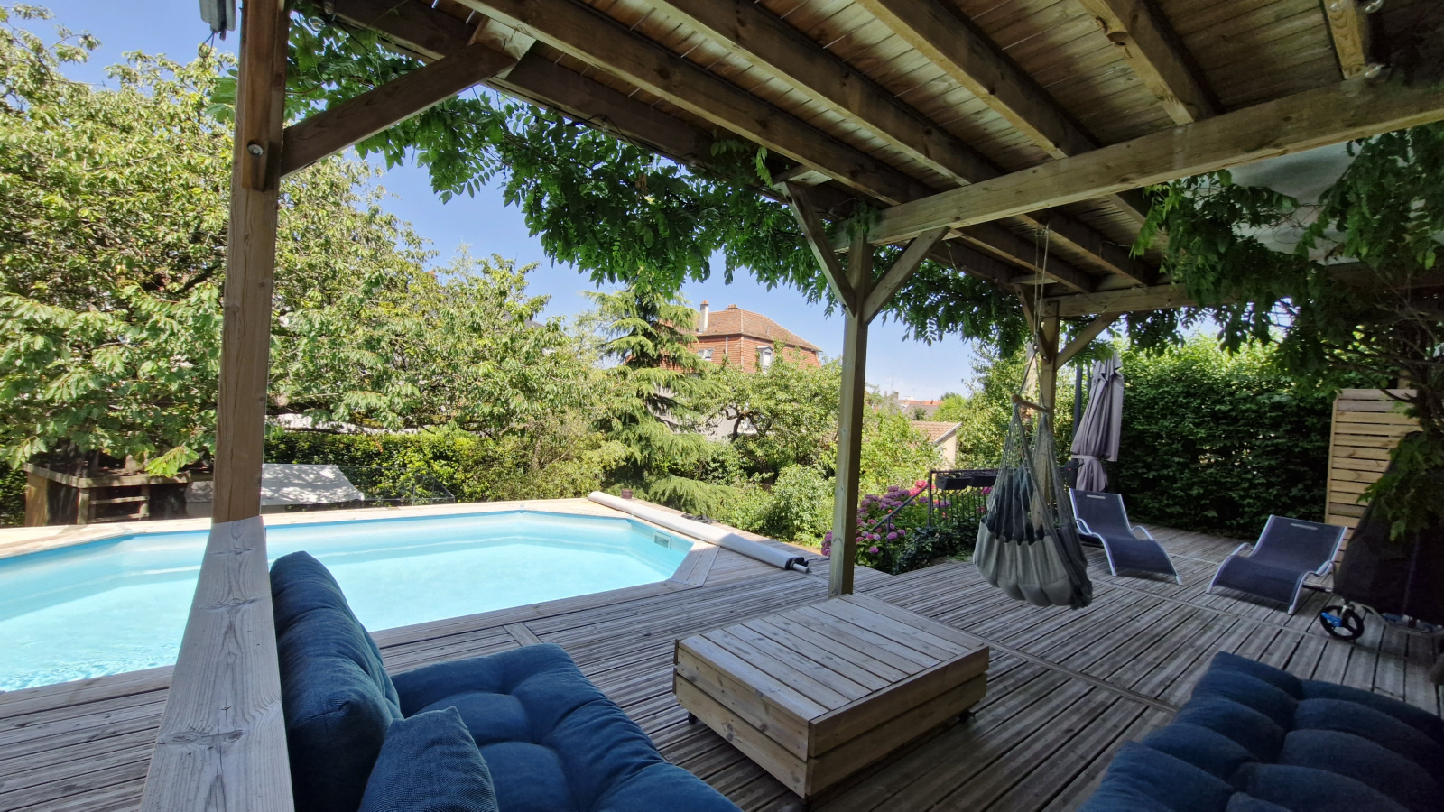 Joli jardin verdoyant, clos et arborés de 6.9 ares avec terrasse couverte, piscine chauffée, parking couvert et garage.