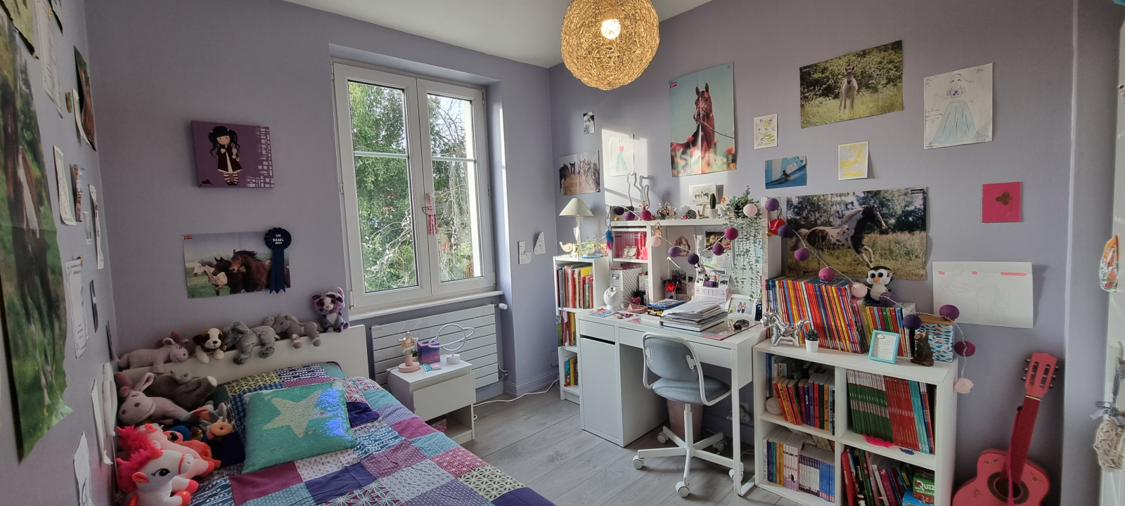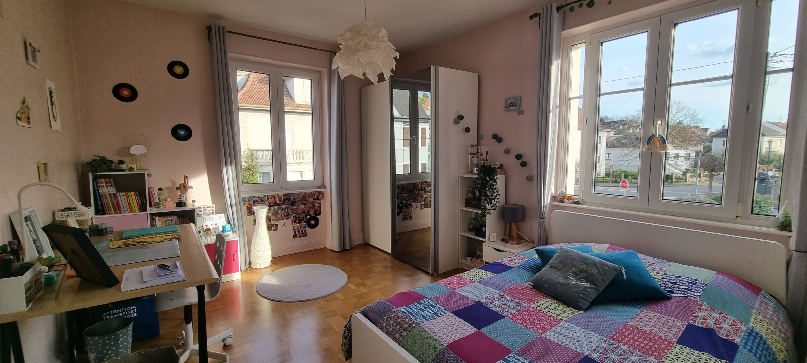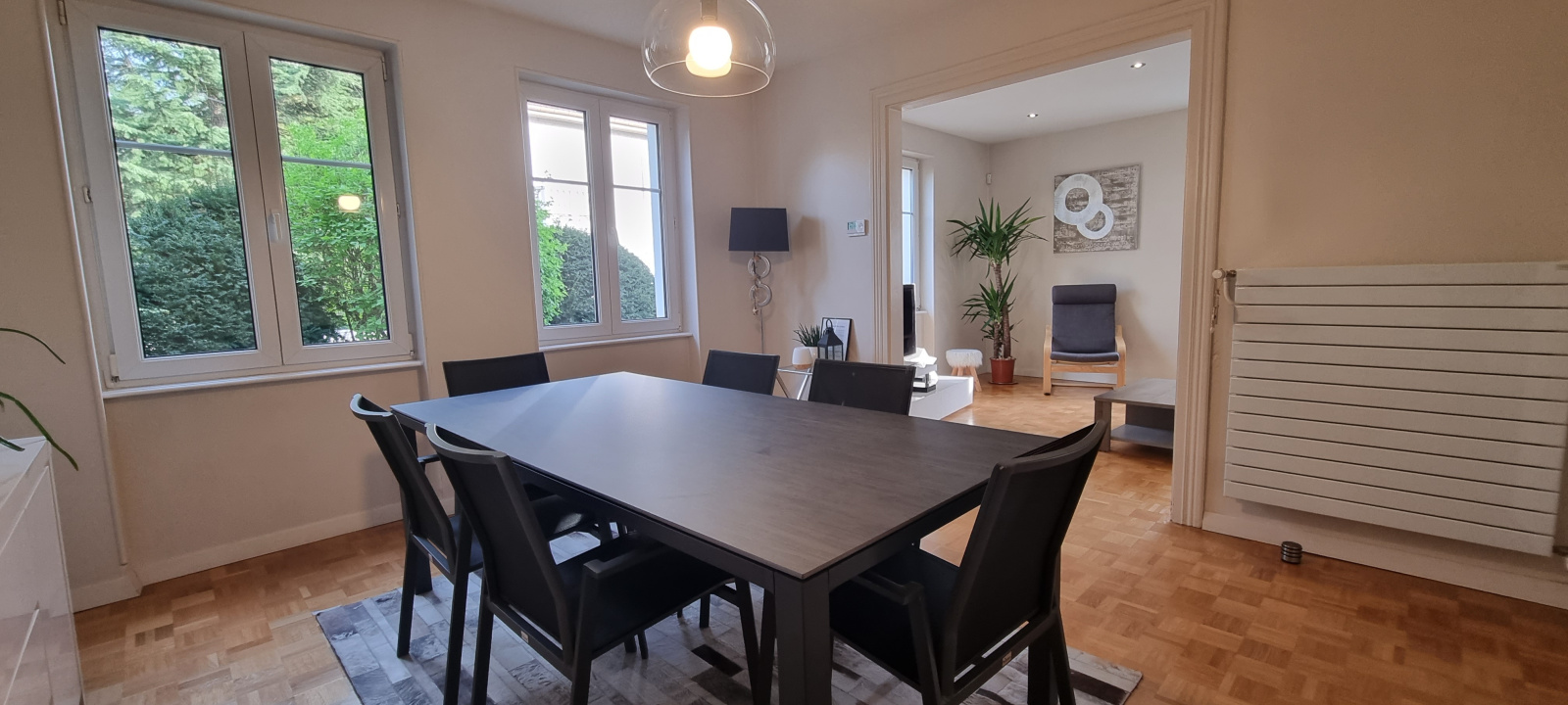séjour chaleureux de 33m² avec parquet massif, cuisine équipée indépendante, 4 chambres, 1 bureau, salle de bain et salle d'eau équipées,