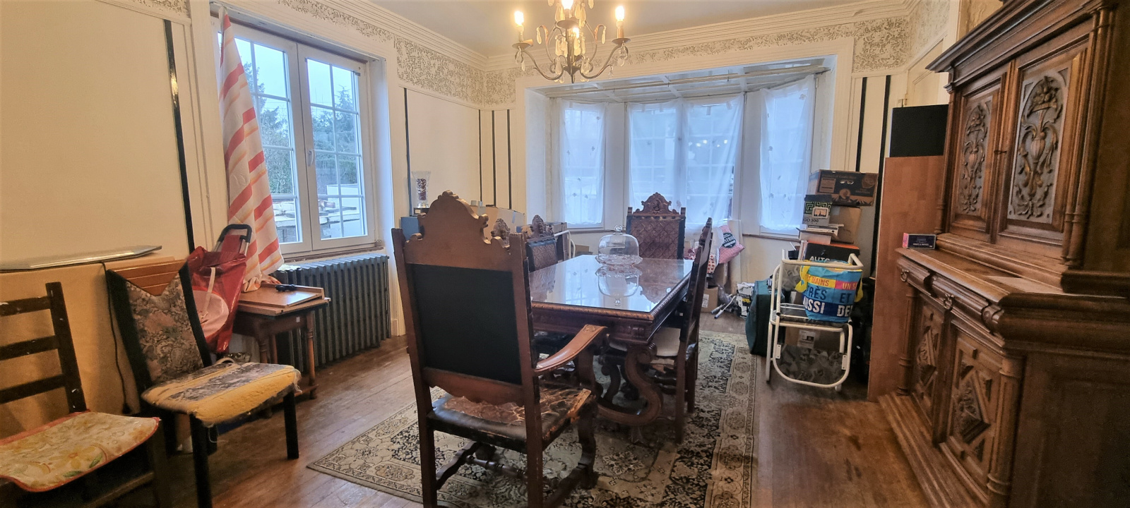 vaste séjour traversant de 46m² avec bow window, cuisine, 5 chambres dont 1 au rdc, salle d'eau, combles aménageables, cave, garage double, sur 8.7 ares. Prévoir travaux.