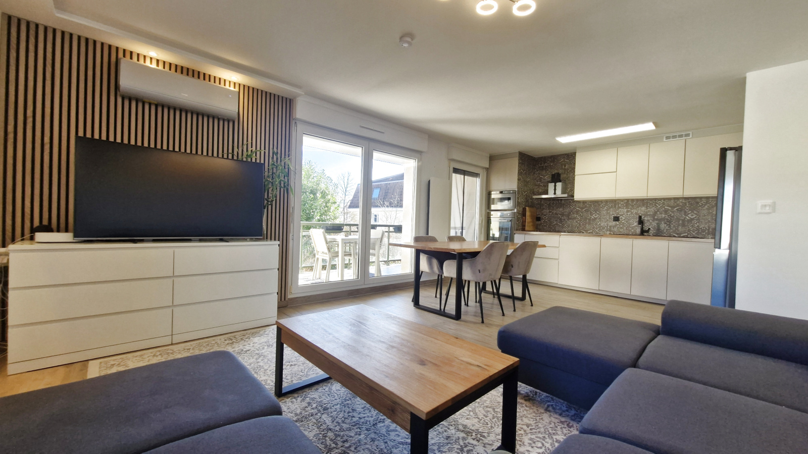 Belle pièce de vie de 32m² composée d'une cuisine équipée américaine, d'un séjour climatisé avec accès à une terrasse profonde carrelée et couverte, 2 chambres, salle de bain équipée, wc, garage carrelé, cave, parking.