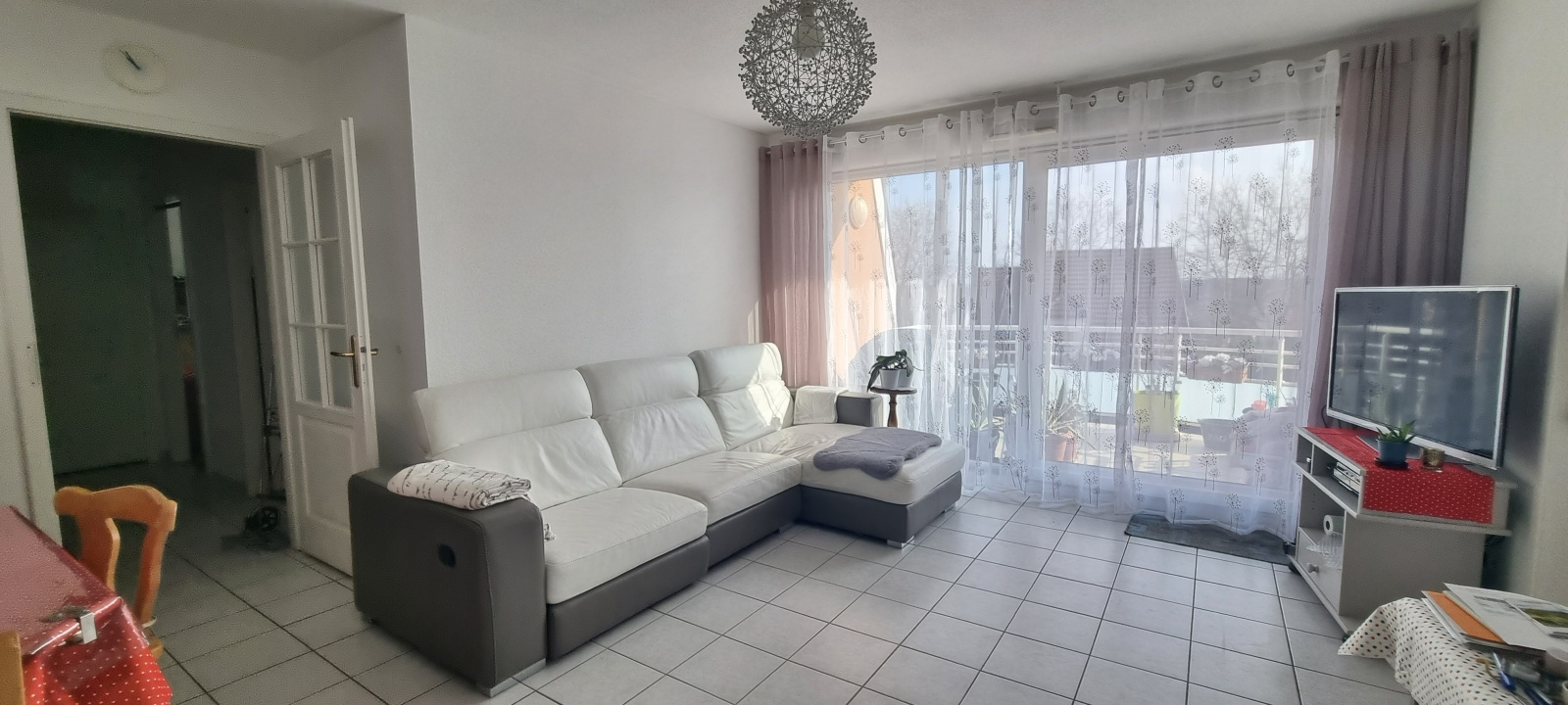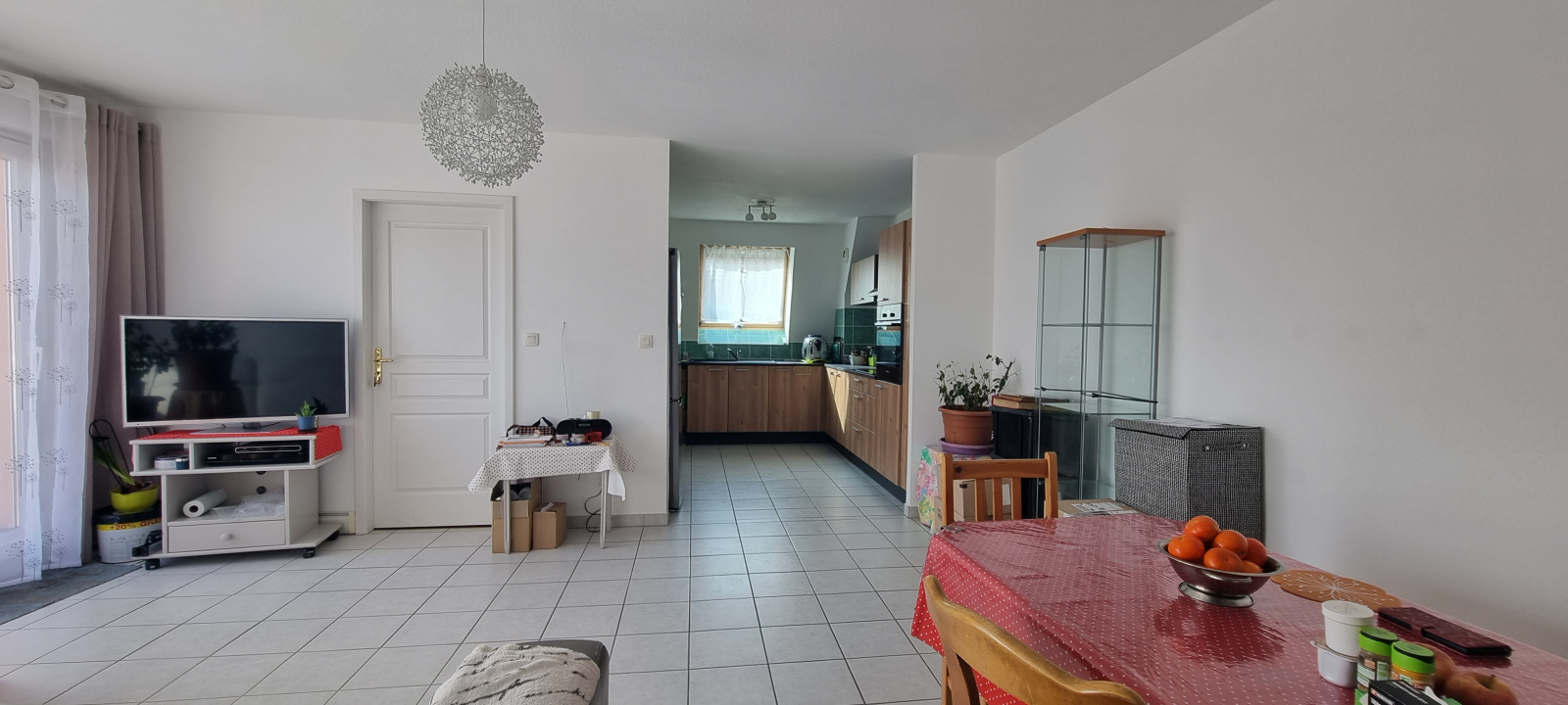 Belle pièce de vie de 33m² avec cuisine équipée neuve, large baie vitrée donnant sur la terrasse, vue dégagée, 3 chambres, salle de bain équipée, wc, parking.